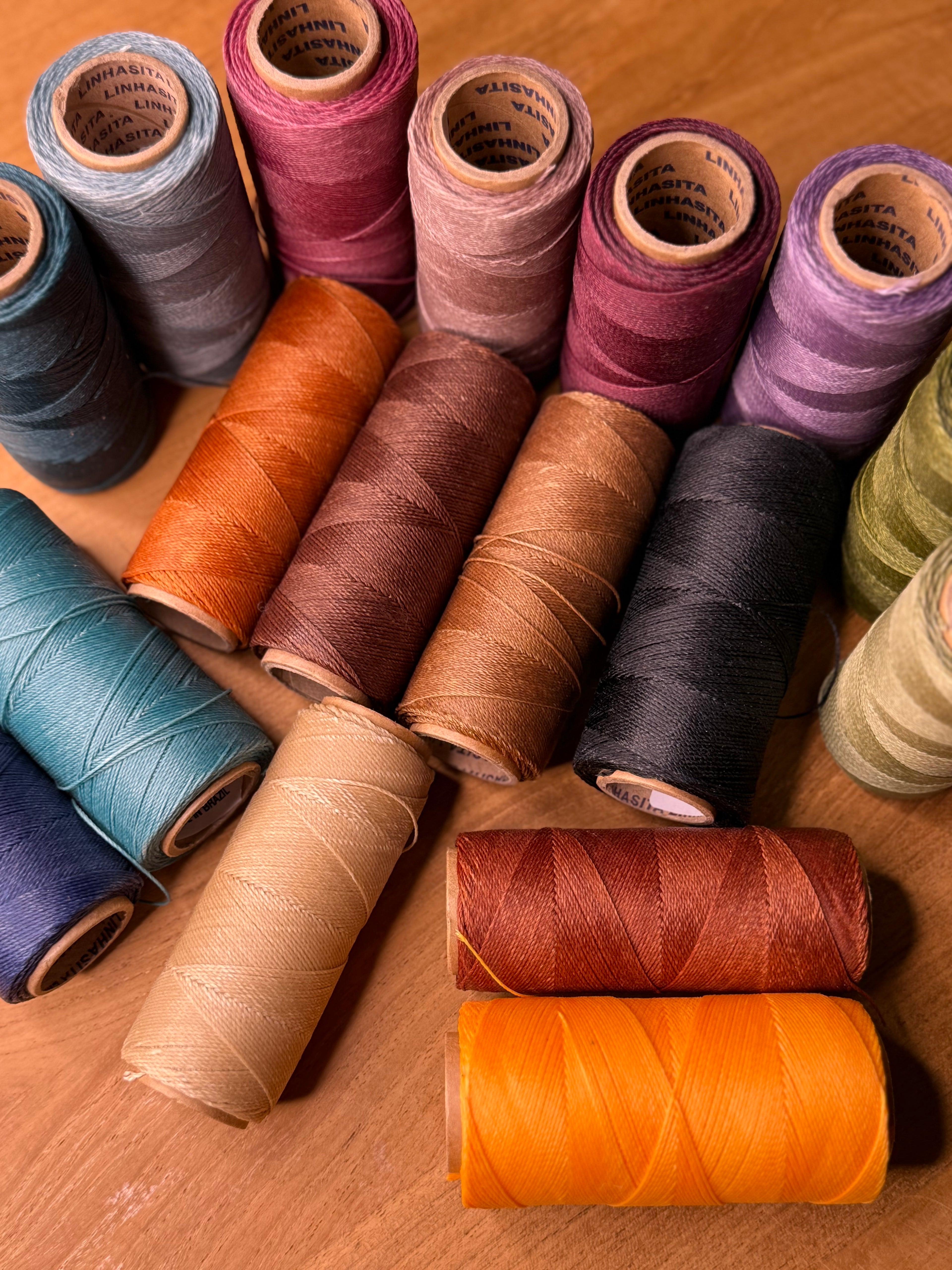 J’utilise des fils en polyester ciré Linhasita, réputés pour leur résistance et leur éclat.